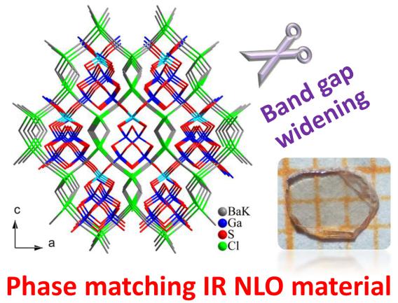 在中科院战略性先导科技专项、国家自然科学基金等项目的资助下,福建物构所结构化学国家重点实验室郭国聪研究员领导的研究团队采用拓宽带隙以调节色散的策略来实现红外NLO晶体材料的相位匹配。通过高温固相法,成功的制备了宽带隙(3.93-3.95 eV)的熔盐硫化物[ABa3Cl2][Ga5S10] (A= K, Rb, Cs)。通过第一性原理计算发现,与其异质同构的硒化物相比,带隙的拓宽使硫化物的色散曲线在红外波段更加平缓,进而使相位匹配的截止波长从5.7 um蓝移至1.7 um,实现了其在传统基频激光(2.0 um)处的相位匹配,这为获得新型相位匹配红外NLO晶体材料提供了新的设计思路。另外,我们获得了毫米尺寸的单晶,测试表明这些硫化物在与商用AgGaS2的NLO系数相当的条件下,具有最高的激光损伤阈值(188-200 MW/cm2 @1064 nm, 脉宽10 ns),同时它们具有较宽的红外透过范围(0.35-12.5 um),是优秀的红外NLO备选材料。相关工作以《Phase Matching Achieved by Band Gap Widening in Infrared Nonlinear Optical Materials [ABa3Cl2][Ga5S10] (A= K, Rb, Cs)》为题,发表在中国化学会CCS Chem. 2020, 2, 964, DOI: 10.31635/ccschem.020.202000268;刘彬文副研究员为该论文第一作者,姜小明副研究员和郭国聪研究员为通讯作者。