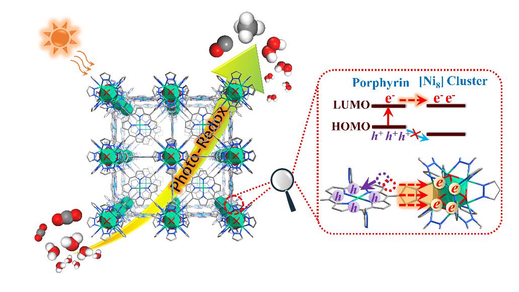 光催化CO2全还原反应,即模拟自然光合作用吸收取之不尽的太阳能将CO2和H2O转化为高附加值产物(如碳氢化合物,CO等),具有重大研究意义与应用前景。晶态多孔的金属有机框架材料(MOFs)具有可调变的组分及结构,理论上能够实现原子级的结构设计与调控,成为近年来备受关注的新兴光催化材料/平台。目前已报道的用于光催化CO2还原的稳定MOFs多由含Zr、Al等的金属氧簇与羧酸配体构成,抬高了金属节点的活化能垒,阻碍了配体/节点界面的电荷转移,相比之下,由催化活性较高的金属元素(如Co, Ni, Cu等)与羧酸配体构成MOFs却无法保持结构稳定。另一方面,当前多数体系使用不经济的空穴牺牲剂以单方面提高CO2还原半反应的产率,同时反应多限于液相,难以利用MOFs气体吸附量高的优势。