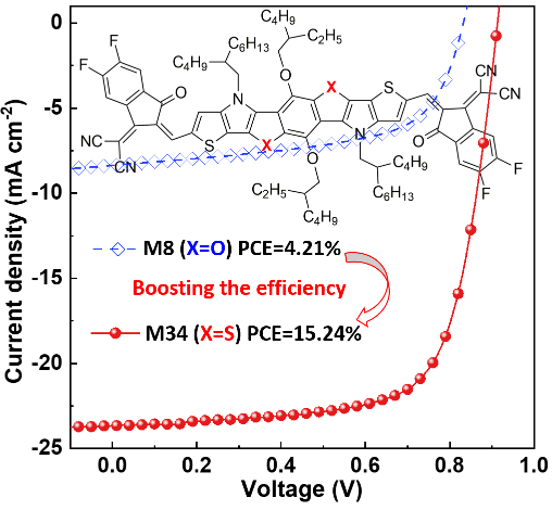 共轭骨架上无sp3碳的非富勒烯受体材料体系,并提出利用“邻位侧链”的位阻效应来抑制受体材料分子的过度聚集。同时,他们通过优化梯形稠环的芳香性实现了对目标受体材料的能级、带隙以及分子取向的调控,最终提高了材料的电荷传输以及光伏性能。器件优化的最优聚合物太阳能电池的光电转换效率达15.24%。该项研究工作成功开发了具有合适带隙和聚集性能的高迁移率无sp3桥碳的非富勒烯受体材料,并展示了梯形稠环的芳香性对带隙、能级、分子取向、电荷传输及光伏性能的影响,为新型非富勒烯受体材料的设计与合成提供了新策略。