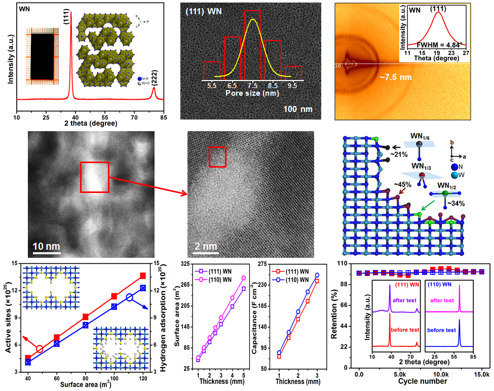 中科院功能纳米结构设计与组装/福建省纳米材料重点实验室谢奎课题组,在国家重点研发计划变革性技术重点专项、国家基金重大研究计划重点项目、中科院洁净能源联合基金和中科院战略先导B等项目支持下,通过晶格重构策略生长出了2 cm尺寸具有三维连通孔道结构的介孔WN单晶,精准控制了晶面取向,并在扭曲表面上构筑了清晰的不饱和活性位点包括W-N1/6、W-N1/3和W-N1/2。多孔单晶扭曲表面上清晰的不饱和金属氮配位活性结构,增强可逆化学吸附,显著提高赝电容;同时,介孔单晶表面精细结构与吸附物种作用清晰,长程有序结构提高电极循环稳定性。