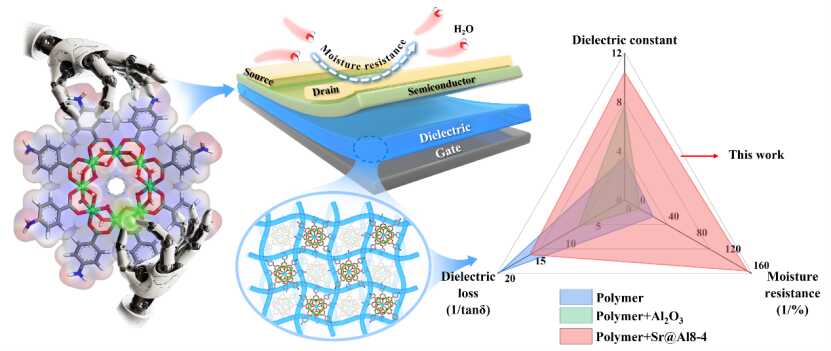 场效应晶体管作为微电子技术的核心,在电子器件领域具有广泛的应用前景。构建具有高介电常数、低介电损耗和良好环境稳定性的聚合物复合介电材料对于提升场效应晶体管的性能和可靠性至关重要。然而,传统的高介电常数掺杂材料如Al2O3、TiO2和高极性聚合物等,仍然存在界面粗糙、易团聚、兼容性不足、损耗高和湿度敏感等问题。由此产生的器件吸湿效应不仅会导致介电性能不稳定,而且阻碍了聚合物复合界面上载流子运输机制的理论研究。