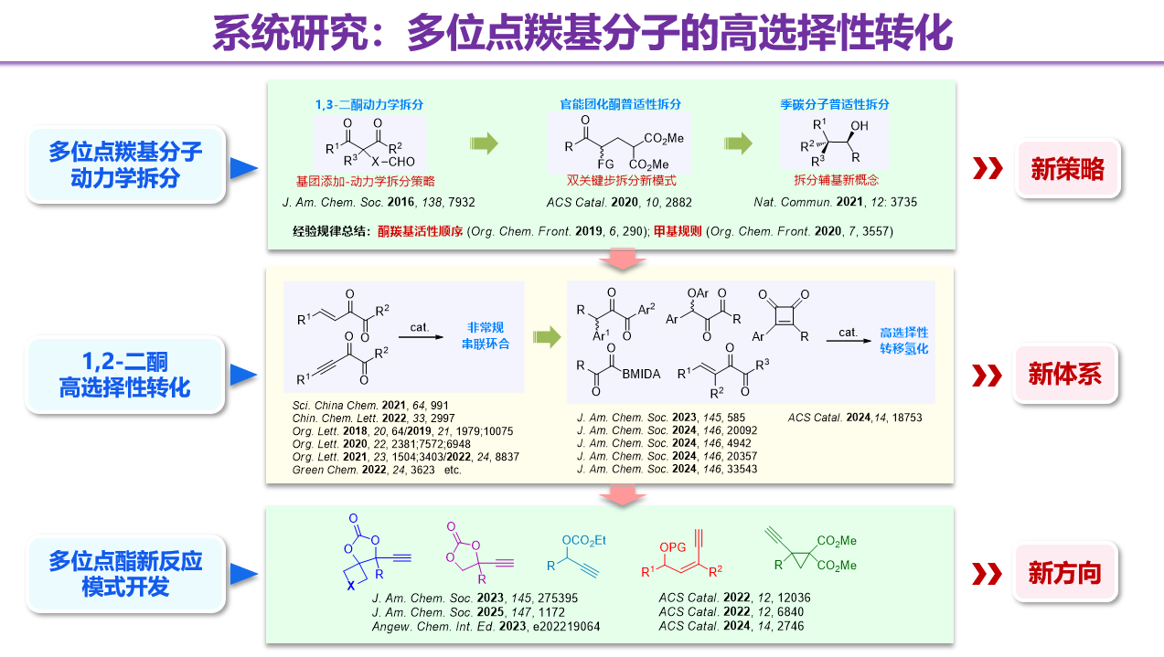 Our research group focuses on asymmetric catalysis and drug synthesis,with a particular emphasis on catalytic transformations involving multisite carbonyl molecules. We have sequentially developed three research directions: (1) kinetic resolution of multisite ketone molecules;(2) highly selective transformations of 1,2-dicarbonyl compounds;and (3) development of novel reaction modes for multisite esters. We prioritize the summarization of empirical regularities while pursuing innovation and breakthroughs. With a strong emphasis on methodological generality,we aim to address various challenges in asymmetric synthesis. By developing new reactions,strategies,and research domains,we strive to enrich the toolbox of organic chemistry and continually expand its boundaries.