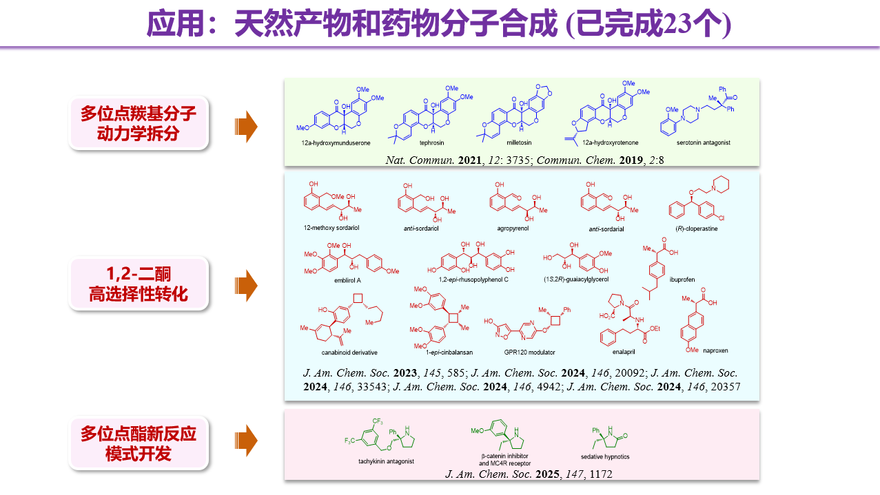 本课题组研究领域为不对称催化和药物合成,尤其以多位点羰基分子参与的催化转化为核心,先后开展了三个研究方向的工作:(1) 多位点酮类分子的动力学拆分;(2) 1,2-二酮的高选择性转化;(3) 多位点酯的新反应模式开发。我们注重经验规律的总结同时追求创新和突破,以方法普适性为重要特色,以解决不对称合成中的各类难点为重要目标,开发新反应、新策略、新研究领域,丰富有机化学的工具箱,不断拓展有机化学的边界。