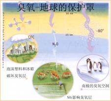 (2)臭氧(O3)层: 臭氧层存在于地球大气的平流层,距表面上10-50公里处。如果所有大气中的臭氧压缩为地球表面的压力,这一层仅仅三个毫米厚,但就是这么小量O3的存在,对地球上的生命起着极为重要的保护作用。由于O3吸收了大部分来自太阳的紫外辐射,使地球表面的动植物及人类免受紫外辐射的伤害,如图(I)所示: