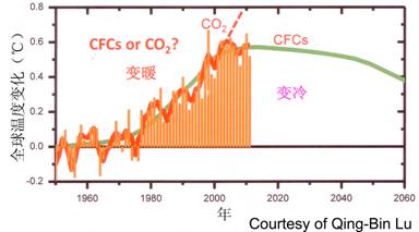 图(II)上绿色波浪线就是根据CRE机制计算的历年总的臭氧(O3)百分数量DO3;而红颜色点及其统计曲线是根据美国国家航空航天局(NASA)从卫星观测到的数据,图下部的圆形示意相应的O3洞。从图上看,至2010年为止,红线和绿线相当好的重迭有力地佐证了CRE反应的正确性。可以说,南极平流层臭氧量的变化完全取决于宇宙线的强度和有效氯的数量.观测数据表明没有二氧化碳和其他非-CFC气体的温室效应迹象。这一研究结果启发了卢庆彬教授进一步探求CFCs和气候变化的关系。