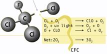 (3)CFCs:学名氯氟烃类(氟氯化碳),如CF2Cl2(CFC-12),CFCl3(CFC-11),俗称“氟里昂”,由于其优良的化学稳定性和无毒性,在世界范围内被广泛用作冰箱和空调的冷却剂,泡沫塑料制造业的冷却介质和喷雾器的喷气燃料等。当CFCs气体被运送到臭氧层,在那里遭遇强的紫外光或电子转移离解反应而分解释放出氯原子(Cl)后,氯原子与臭氧经过化学反应转变为氧气(O2),则臭氧(O3)即耗损。