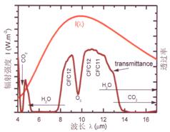 述及CFCs对全球气候的影响,卢教授在文中说:“一般认为CFCs仅仅是全球变暖中的小角色,因为它在大气中的浓度≤ 540 ppt,比非 -CFCs温室气体(CO2,CH4,N2O)的浓度低1千到1百万倍。”。例如到2002年,CO2的浓度已升至377 ppm,而一个ppm等于一百万个ppt。所谓“温室气体”是指大气中自然或人为产生的能够吸收地球长波辐射而使地层升温的气体成分,而“温室效应”是指温室气体吸收地表向外放出的长波热辐射而形成热覆盖罩子,使地表与低层大气温度增高的类似于温室的作用。因此,温室效应的强弱不仅在于气体的多寡,更在于其吸收长波辐射的能力。卢教授在正文(II)的第一部分给出了“地球黑体辐射强度谱(红色线)和大气透过率谱(枣红色线)”如图(VI)所示,枣红色谱注明了各种温室气体的吸收波段。