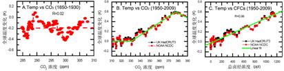 图 VII. 全球温度变化与CO2和CFCs浓度的关系。A:从1850至1930;B和C:从1950至2009。注意,CFCs自20世纪70年代才大量排放进入大气层。图上的历年全球温度数据是由英国气象局(UK Met Office)和美国国家海洋大气局(US NOAA)提供的;只对数据进行了3点平滑处理。