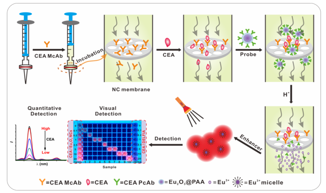 1、基于稀土纳米探针的荧光增强策略实现唾液肿瘤标志物即时检测示意图
