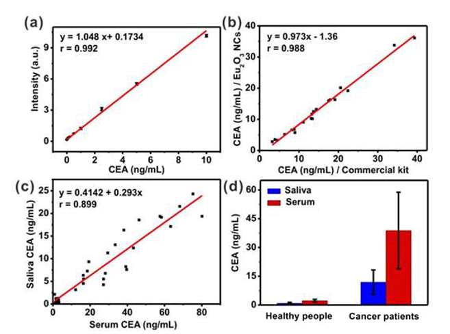 2(a) 基于Eu2O3纳米荧光探针的唾液CEA浓度测定校准曲线。(b) 分别基于Eu2O3纳米探针和商用Eu3+-DTTA试剂盒测定的20份人唾液样本CEA浓度的相关性曲线。(c) 基于Eu2O3纳米荧光探针测定33名志愿者唾液和血清样本中CEA浓度的相关性曲线。(d) 健康人和口腔癌患者血清和唾液样本中CEA浓度的平均水平对比情况