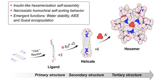 在中科院战略性先导科技专项、国家杰出青年基金等项目的支持下,中科院福建物构所结构化学国家重点实验室孙庆福研究员团队近期在六聚镧系有机胶囊三级结构和功能涌现研究取得重要进展。通过逐级的金属配位导向自组装和阴离子配位导向自组装过程,作者成功构筑了首例镧系有机六聚体胶囊。连续的手性诱导和手性自分类组装过程,使得配体点手性的引入最终放大到纯手性的六聚体胶囊。六聚体涌现出许多孤立的螺旋体所不具备的新性能,如显著提高的水稳定性和聚集诱导荧光增强。此外,尽管螺旋体本身不具有空腔,聚集成三级结构后所形成的手性空腔不仅可以包裹烷烃类有机小分子和金属茂基化合物,而且可以立体选择性识别手性萜类药物分子。