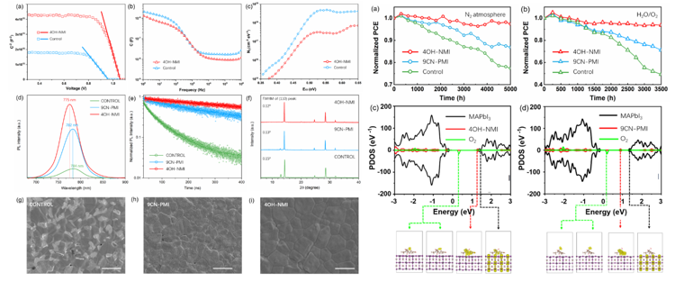 中科院功能纳米结构设计与组装/福建省纳米材料重点实验室高鹏研究员将路易斯碱官能团与质子官能团于聚芳香共轭分子上进行了组合,得到了纯路易斯碱体系分子9CN-PMI与路易斯碱/质子体系分子4OH-NMI,并将其引入到钙钛矿前驱体溶液中,制备得到了钝化之后的钙钛矿薄膜与器件。通过对两种不同类型分子的表征对比,证明了具有路易斯碱/聚芳香共轭/质子结构的分子4OH-NMI能够起到更加优异的化学钝化(Chemical passivation)作用,其所拥有的C=O/-OH官能团体系不仅能够有效钝化正负电荷缺陷与铅团簇,钝化剂的-OH可以通过氢键与I-相互作用,从而促进C=O基团与反位Pb2+缺陷的相互结合,使得钝化效果最大化。与此同时,通过理论计算与稳定性测试,证明了4OH-NMI具有更加显著的能带钝化(Energetic passivation)作用,即钝化分子产生良性的中间能隙态,该能隙态位于O2产生的电子陷阱态之上,能够抢在O2之前捕获钙钛矿上的光激发电子,避免超氧离子的形成,进而提高钙钛矿器件的稳定性。此外,意外地发现4OH-NMI9CN-PMI的加入可以提高钙钛矿前驱体溶液的粘度,从而显著增加钙钛矿膜的厚度以实现更高的光收集效率。最终4OH-NMI钝化后的钙钛矿电池效率高达23.7%且表现出优异的稳定性。相关成果发表在Advanced Materials10.1002/adma.202008405
