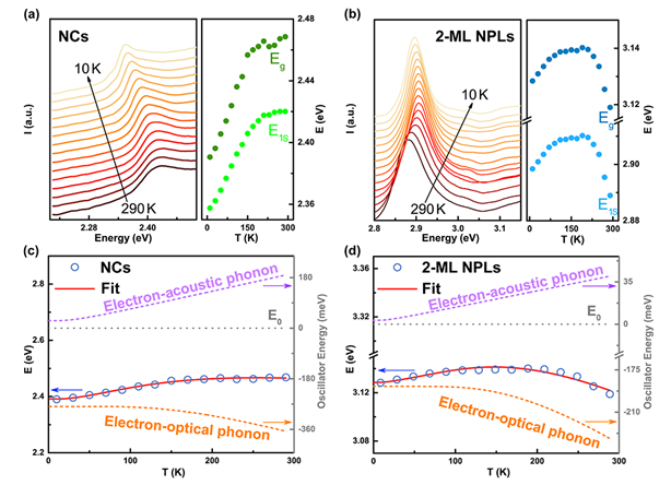 图3、CsPbBr3纳米晶(a)和量子片(b)的变温吸收谱及带隙的温度依赖曲线;纳米晶(c)和量子片(d)带隙的温度依赖曲线的玻色-爱因斯坦双振子模型拟合结果。
