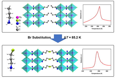 在前期的研究基础上,团队创新结构设计思路,利用精确分子工程修饰的策略,发展了具有高居里温度的二维钙钛矿光铁电体。研究结果发现,通过溴原子取代有机基元中的氢原子,构筑了新的二维钙钛矿材料不仅保持原有的极性结构,而且其铁电相变居里温度有了显著提高(ΔT = 85.4 K)。进一步单晶结构与理论计算分析表明,有机基元与无机骨架之间卤素的相互作用以及重的卤素原子导致了铁电相变能垒提高,从而增加了光铁电体的居里温度。同时,我们结合了铁电极化的本质以及钙钛矿材料优异的半导体特性,基于钙钛矿单晶器件,在其晶体学极轴方向获得了明显铁电光伏效应。该研究工作为设计具有高居里温度的光铁电体提供了新思路,相关研究结果以通讯形式发表在《美国化学会志》(J. Am. Chem. Soc.2021, 143(20), 7593–7598),该论文的第一作者为已毕业的国科大博士生吴振跃。