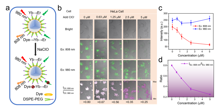 3a)基于IR808修饰CsLu2F7:Yb/Er上转换纳米探针的次氯酸根检测示意图;(bIR808 修饰CsLu2F7纳米探针与加入不同浓度次氯酸根的HeLa癌细胞孵育后的共聚焦图像;(c808nm980nm激发的上转换发光积分强度和(d)相应的积分强度比值。