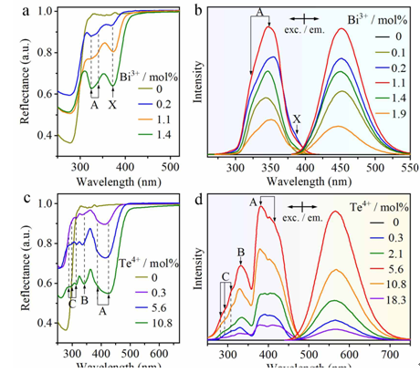 图2、Cs2SnCl6: x%Bi3+微晶的(a)漫反射谱、(b)激发(λem = 456 nm)和发射(λex = 347 nm)光谱; Cs2SnCl6: x%Te4+微晶的(c)漫反射谱、(d)激发(λem = 565 nm)和发射(λex = 382 nm)光谱。