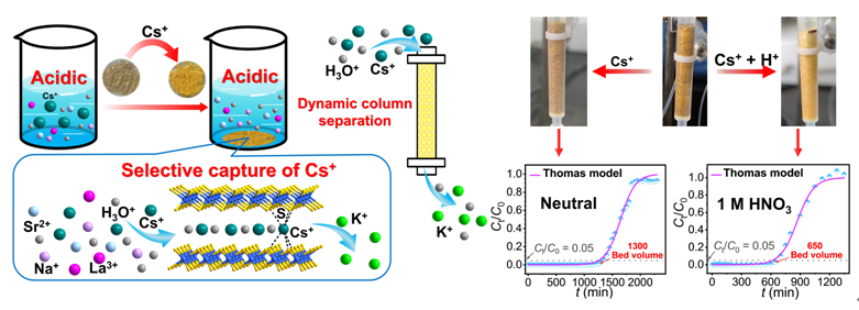 铯(137Cs)是乏燃料中的主要裂变产物之一,放射性强、释热量大且半衰期较长,对核废物的贮存和处置影响大,一旦泄露到环境中将严重威胁生态环境和人类健康。从复杂溶液中快速有效捕获放射性Cs+离子对环境保护、人类健康和核能的可持续发展具有重要意义。高放废液常呈强酸性,环境体系非常复杂,含盐量高,为Cs+离子的选择性分离带来诸多困难。离子交换法去除铯因其具有便捷、高效、成本低、二次污染少等优势受到了广泛关注。然而,由于现有离子交换材料的稳定性问题和酸性环境中质子的强烈竞争,从酸性溶液中高选择性地捕获Cs+离子仍然具有极大的挑战性。
