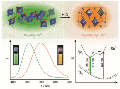 1Sb3+掺杂Cs3InCl6Cs2InCl5·H2O纳米发光材料:结构相变示意图、发射光谱与发光照片、发光机理示意图。