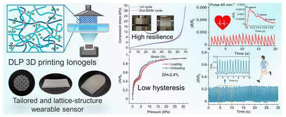 图:光固化3D打印高弹性的离子凝胶用于制备低迟滞柔性传感器