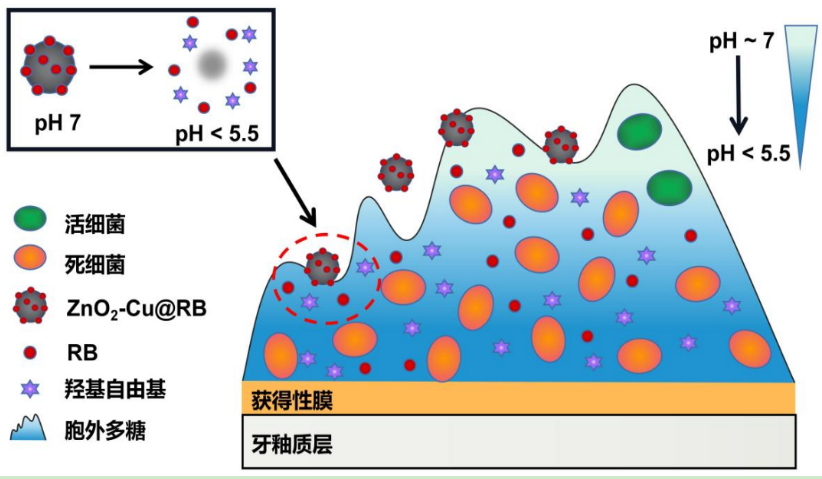 近日,在国家自然科学基金面上项目、福建省创新人才项目、福建省自然科学基金等项目资助下,中国科学院海西研究院陈卓课题组利用金属过氧化物(ZnO2-Cu)与抗菌药物孟加拉玫瑰红(Rose Bengale, RB)的结合,首次发展出一种pH响应型的纳米复合材料(ZnO2-Cu@RB)。该纳米材料在酸性生物膜微环境中产生过氧化氢和二价铜离子,发生类芬顿反应而生成高毒性的羟基自由基,从而高效且快速灭杀生物膜内变异链球菌。同时,该纳米材料在较低剂量时即能抑制变异链球菌的产酸能力及其生物膜的形成,有效遏制了龋齿的发生发展。尤其值得一提的是,该纳米材料只在酸性生物膜微环境中发挥效应,因而对正常组织毒副作用极小,具有良好的生物安全性。该工作为临床上预防和治疗龋齿提供了崭新的研究思路和方向,有望成为临床上治疗细菌生物膜相关感染的新策略。相关成果以“Bacterial biofilm microenvironment responsive copper-doped zinc peroxide nanocomposites for enhancing chemodynamic therapy”为题,发表于Chemical Engineering Journal (http//doi.org/10.1016/j.cej.2022.137214)。中国科学院大学博士研究生张宇翔为本文第一作者,陈卓研究员和刘雯珍博士后为共同通讯作者。