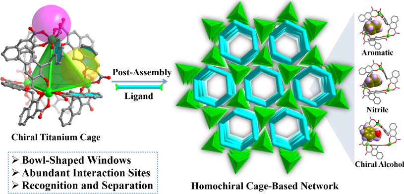 1. 通过后组装修饰策略构建手性Ti4L6笼基框架材料应用于分子异构体识别与分离。