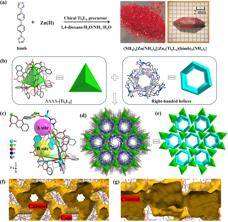 2. 合成路线及相关晶体结构图。手性Ti4L6笼的作用位点:A点,未配位的裸露羧基氧原子B点,萘环基团