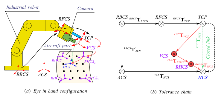 近日,中国科学院福建物质结构研究所杨永泰课题组,在前期航空结构自动化制孔相关研究基础上,发展了一种机器人装配系统定位精度增强技术。对机器人装配系统与航空结构相对定位误差的形成进行了分析和建模,引入测量装置实现相对定位误差测量和补偿,从容差管理的角度对测量装置不同配置方式下的相对定位误差进行了理论比较,推荐了视觉系统手眼配置方式。基于定位误差雅克比,探索了手眼偏置对定位精度的影响,指导末端执行器设计和视觉坐标系设置。提出了在机手眼标定和系统定位方法,消除机器人绝对定位误差相异的影响。进而开发了多功能机器人装配系统的集成控制系统。该研究为航空结构机器人制孔和连接系统的定位精度增强提供了理论依据。