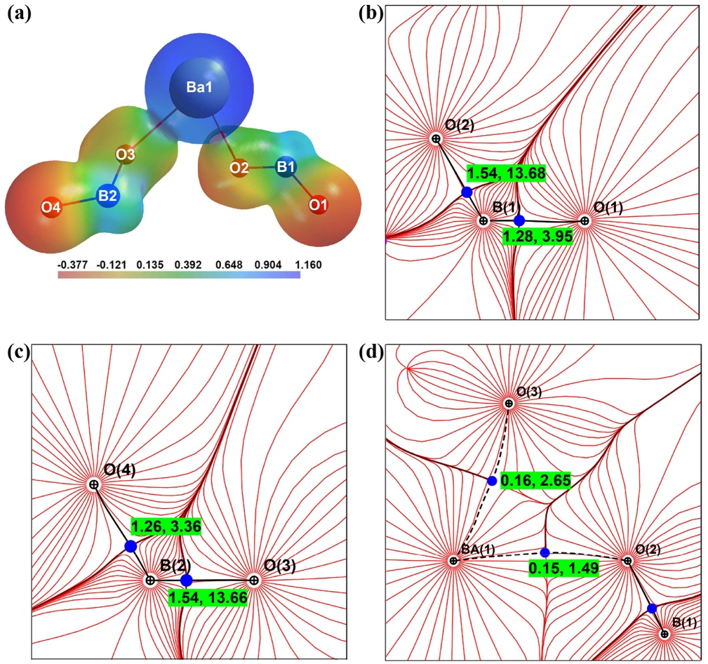 1. aBBO不对称结构单元在等值面为0.13 e -3处的静电势等值面图,蓝色和红色分别代表正电荷区和负电荷区;bcd分别代表O(1)B(1)O(2)O(3)B(2)O(4)O(2)Ba(1)O(3)面的实验电子密度梯度轨迹图。图上蓝色点表示键临界点,靠近键临界点的两个数字分别为键电荷和拉普拉斯量。