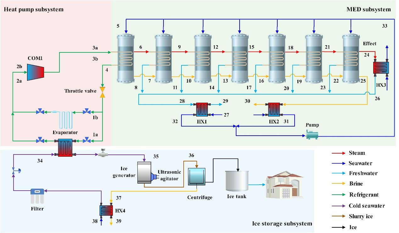 近期,中国科学院福建物质结构研究所汪凤翔课题组针对低能耗的海水淡化技术与热泵系统的耦合展开了研究,提出了一种基于热泵的多效蒸发-冷冻淡化-冰蓄冷的耦合系统。该系统充分利用了热泵系统冷凝温度与多效蒸发淡化的首效蒸发温度接近的特点,热泵冷凝器用于多效蒸发淡化,同时蒸发器利用过冷水法制取流态冰,通过离心获得脱盐冰,并作为冷能存储介质按需为建筑供给冷量,融化后的冰获得额外淡水,实现能量的多级利用。这项研究成果已发表在 《Energy》期刊上("Thermodynamic and economic analysis of an integration system of multi-effect desalination (MED) with ice storage based on a heat pump" Energy 283 (2023) 129064)。陈龙祥副研究员是该论文的第一作者,通讯作者兰文超是中国科学院福建物构所与福州大学联培硕士生。