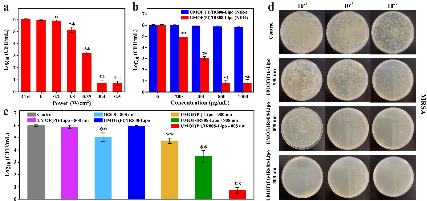2. UMOF(Pt)/IR808-Lipo纳米平台的PDT抗菌实验:a)不同功率密度(0-0.5 W/cm2)的808 nm激光辐照下UMOF(Pt)/IR808-Lipo的抗菌效果;b)功率密度为0.4 W/cm2808 nm激光辐照下,不同浓度(0-1000 g/mLUMOF(Pt)/IR808-Lipo的抗菌效果;c) UMOF(Pt)-LipoIR808UMOF/IR808-LipoUMOF(Pt)/IR808-Lipo在不同光照条件下对MRSA的抗菌效果;d) UMOF(Pt)-LipoUMOF/IR808-LipoUMOF(Pt)-Lipo在不同光照条件下对MRSA的抗菌效果照片