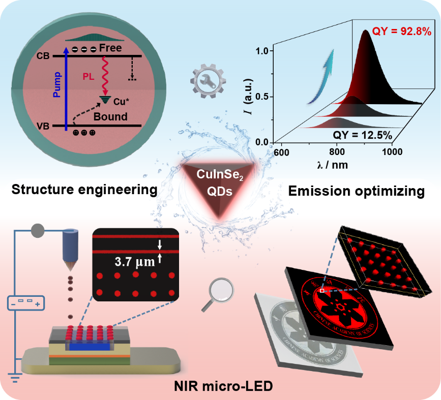 近期,中国科学院福建物质结构研究所/闽都创新实验室的陈学元团队涂大涛研究员等在国家自然科学基金重点项目和区域创新发展联合基金等项目支持下,成功研发出CuInSe2:Zn2+CISe: Zn2+)基高效近红外量子点荧光粉,并首次将其应用于micro-LED(图1)。
