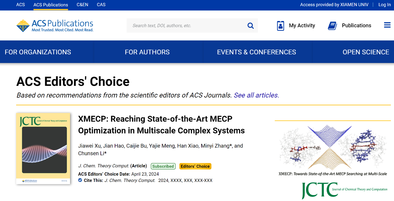 现有的量化计算程序可较为广泛地支持采用各类量子力学(QM)方法优化MECP结构,但对于生物、材料等复杂体系,全QM计算的代价一般无法接受,因而兼顾化学反应环境影响因素和计算精度效率的组合量子力学/分子力学(QM/MM)等多尺度计算方法成为了该领域的主要关注对象。目前尚没有公开的量化计算程序能较好地实现在多尺度QM/MM级别下优化MECP结构,以满足研究生物蛋白环境、溶液或材料的体相环境对MECP和多态反应影响的需求。为解决相关科学问题,中国科学院福建物质结构研究所李春森课题组开发了能够在多尺度体系QM/MM级别下优化MECP结构的XMECP程序,该工作以题目“XMECP: Reaching State-of-the-Art MECP Optimization in Multiscale Complex Systems”发表在理论计算化学的权威刊物Journal of Chemical Theory and Computation上,并入选ACS Editors’ Choice亮点文章,作为头条新闻在美国化学会网站报道。
