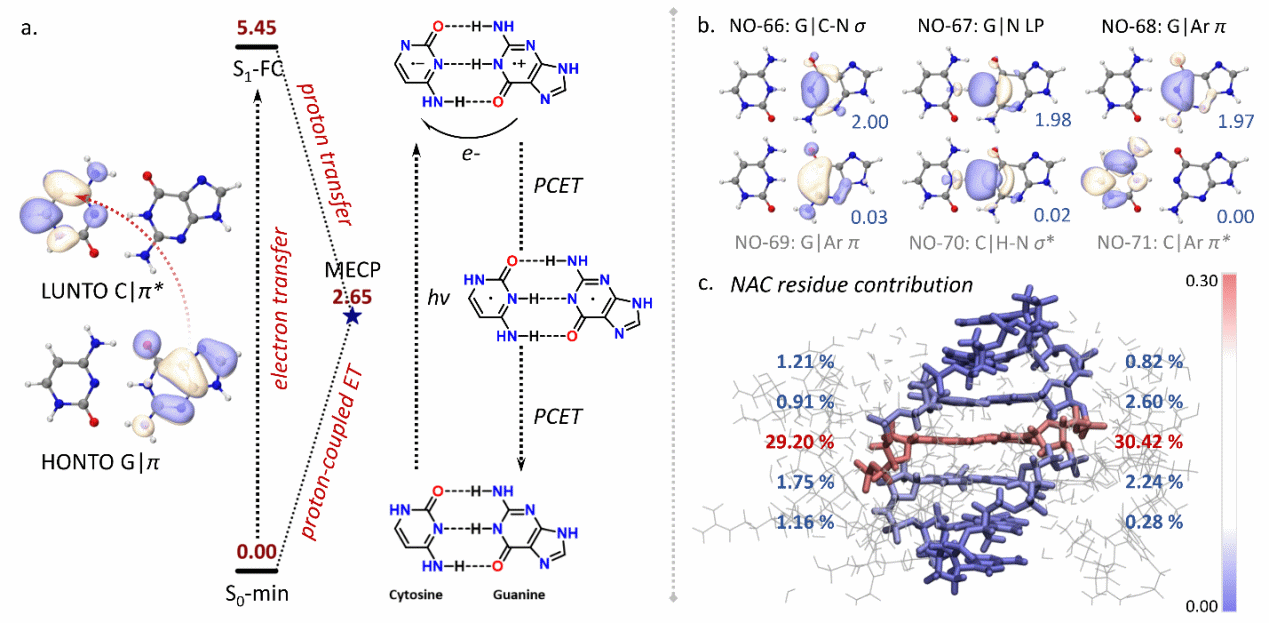 (1)使用XMECP程序研究胞嘧啶-腺嘌呤碱基对的光致质子耦合电子转移反应,发现远离反应中心的核苷酸残基通过π-π堆积的非共价相互作用链对非绝热耦合矩阵元产生贡献,从而促进反应中心的非绝热跃迁过程。