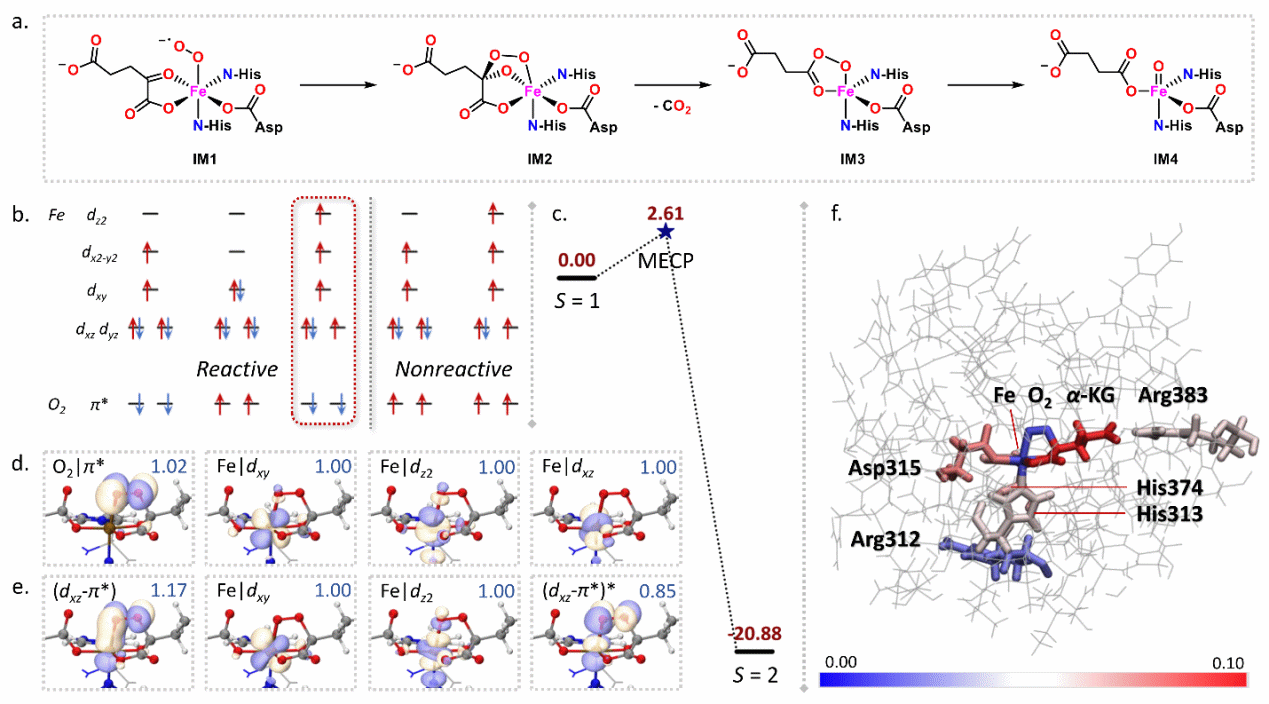 图2.含铁的2-氧代谷氨酸依赖酶活化氧气的机理,其中不直接参与反应的Arg383残基通过两组氢键对旋轨耦合矩阵元产生了显著的贡献,甚至高于活性中心的铁氧物种。