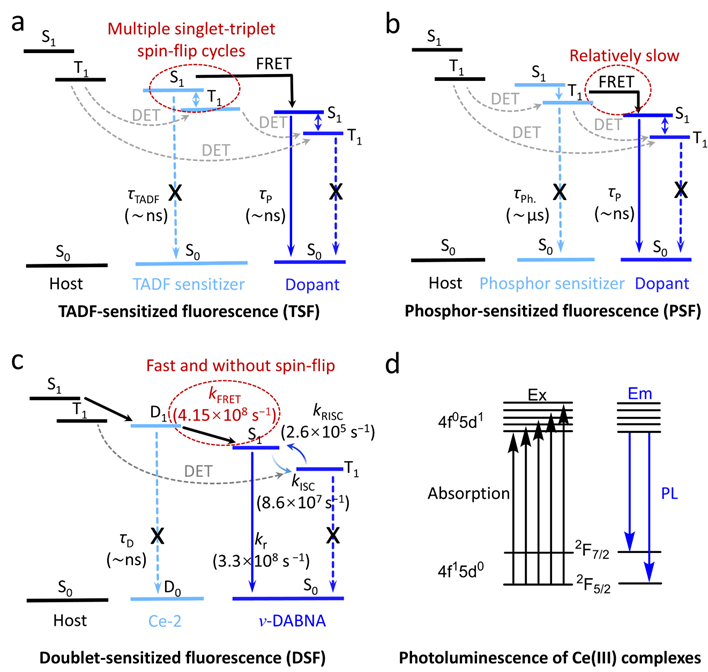 超高清显示对有机发光二极管(OLED)的性能提出了越来越高的要求,即高效率、长寿命和高色纯度。近年来,多重共振型热活化延迟荧光(MR-TADF)材料由于其高效的窄带发射特性而得到迅速发展,在实现高效率高色纯度OLED方面极具潜力。不过,MR-TADF分子通常表现出较长的激子寿命(通常为几十甚至上百微秒),这使得其器件(特别是蓝光OLED)的稳定性面临极大挑战(蓝光发光层中激子累积碰撞生成的高能激子会导致化学键解离)。快速高效的激子利用是实现稳定高效蓝光器件的关键解决方案。为此,研究者们使用较短激子寿命的磷光材料和TADF材料作为MR-TADF材料的敏化剂,即采用磷光敏化荧光(PSF)和TADF敏化荧光(TSF)策略,很大程度地提升了MR- TADF器件的性能。然而在PSF和TSF机制中,激子利用的效率和速率仍不可避免地受到自旋统计和跃迁禁阻的限制(如图1a-b)。