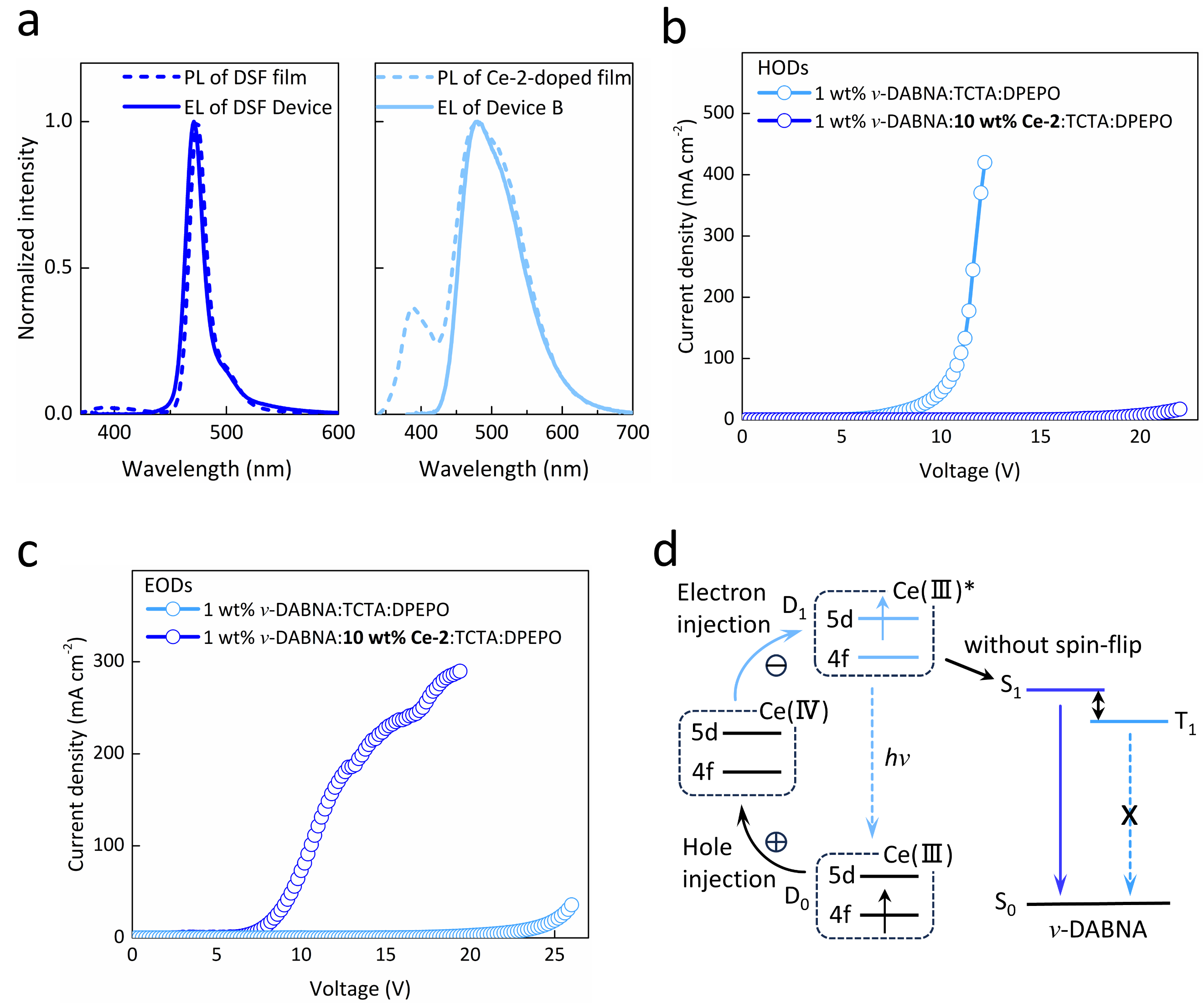 研究团队采用双线态发射的稀土配合物Ce-2作敏化剂,MR-TADF材料ν-DABNA作为终端发射材料,制备了DSF-OLED(图2a)。实验证明,DSF-OLED发光层中Ce(III)先捕获空穴氧化为Ce(IV),接着与注入的电子结合形成双线态的Ce(III)*。Ce(III)配合物独特的空穴捕获和电子传输能力(图3a-c),保证发光层中主要形成双线态激子,再通过Förster能量传递(FRET)将能量转移至客体分子(图3d。这与光激发下的机制略有不同,如图1c,光激发下有部分激子在主体材料上形成)。由于规避了涉及三线态的慢激子动力学过程,DSF系统实现了极快的FRET(kFRET = 4.15 × 108 s−1),且FRET效率高达93.5%。由于具有很高的激子利用率和极短的激子停留时间(1.36 μs,图2f),DSF-OLED实现了高效的深蓝光发射,最大外量子效率为30.0%,相比于敏化前的器件效率(9.5%)提升了两倍多,最大亮度也从3742 cd m−2增加到23860 cd m−2,1000 cd m−2的亮度下CIE色坐标为(0.13,0.14),效率滚降仅为14.7%(图2b-d)。与传统的相关PSF-OLED和TSF-OLED相比,该DSF-OLED的综合性能指标(效率、色纯度、效率滚降)具有优势(图2e)。值得一提的是,相较于同等条件下制备和表征的非敏化器件,DSF-OLED运行寿命有非常显著的提升(9.1 h versus 7 min)。该研究表明,DSF策略在实现高效、稳定、高色纯度的蓝光OLED方面具有很大潜力,有希望在实现超高清OLED显示中发挥重要作用。