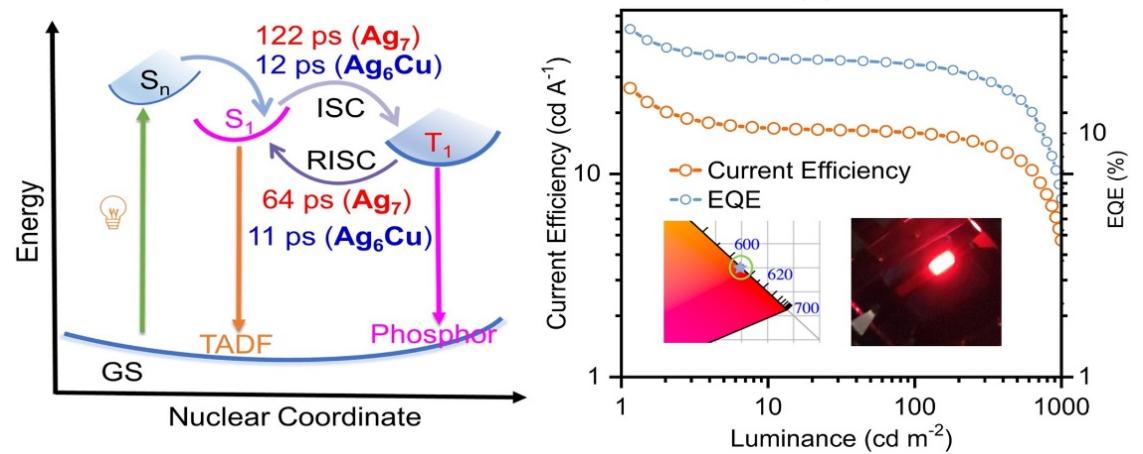图2. 左:金属团簇Ag7和Ag6Cu的发光机理示意图;右:基于金属团簇Ag6Cu的CP-OLEDs的电流效率/外量子效率对亮度的关系曲线;插图为电致发光的CIE坐标图及器件发光照片