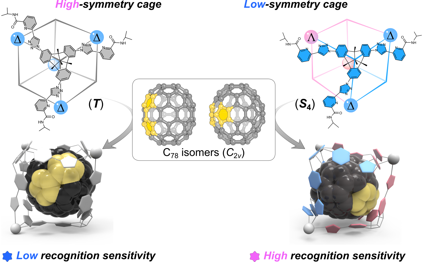 近日,中国科学院福建物质结构研究所孙庆福研究员团队联合华中科技大学卢兴教授团队,在《Nature Synthesis》期刊发表了题为“Low-Symmetry Coordination Cages Enable the Recognition Specificity and Selective Enrichment of Higher Fullerene Isomers”的研究论文。该研究基于碗状三苯三戊并烯配体构建了具有不同对称性空腔微环境的稀土配位分子笼,利用主客体间π作用精细调控实现了对高阶富勒烯异构体的特异性识别和选择性富集。主客体化学研究表明,相较于高对称性笼(T-3),低对称性笼(S4-4)在识别键合D2-C76异构体时表现出显著优势。通过精准的形状匹配,S4-4笼有效约束了其空腔内富勒烯客体的无规则转动,并导致主体对称性从原来的S4降低至C2。这一策略进一步被用于识别一对堪称孪生兄弟的C2v对称性的C78异构体。这对孪生富勒烯的区别仅在于两个相邻五元环的取向不同,只需一步Stone-Wales单键旋转即可实现彼此结构转化。结果显示,低对称性笼(S4-4)在识别灵敏度和结合力差异方面显著优于高对称性笼(T-3),在分离纯化高阶富勒烯异构体方面表现出独特优势。