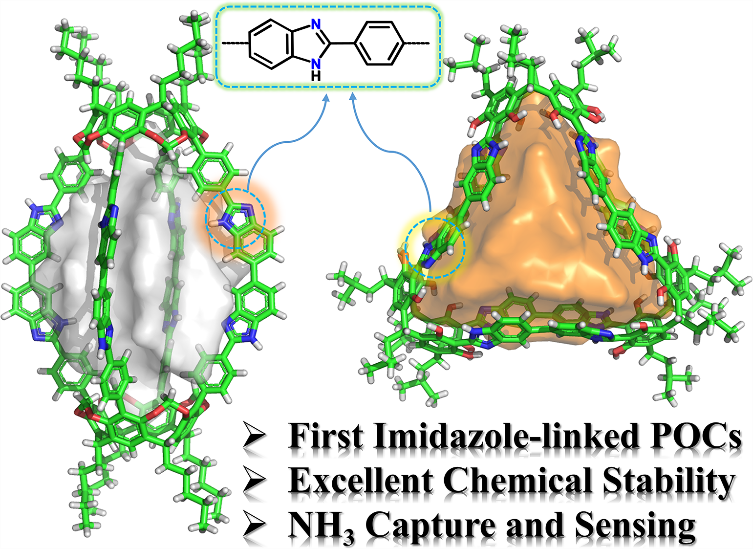 近日,中国科学院福建物质结构研究所袁大强团队在《Angewandte Chemie International Edition》期刊发表了题为“Ultrastable Imidazole-linked Porous Organic Cages for Ammonia Capture and Detection”的研究论文。该研究通过原位环化策略,首次成功构建了四例超稳定咪唑连接多孔有机笼(IPOCs),包括三例[2+4]灯笼状结构和一例[3+6]三棱柱结构。研究团队以四甲酰基杯[4]芳烃为核心构筑单元,与双邻苯二胺单体在无催化剂、温和条件下通过单釜反应实现咪唑键的自发形成,合成产率最高达94%。单晶X射线衍射证实,IPOCs具有高度有序的孔隙结构,其中IPOC-1的比表面积为319 m² g⁻¹,IPOC-4更高达1162 m² g⁻¹,显著优于同类材料。
