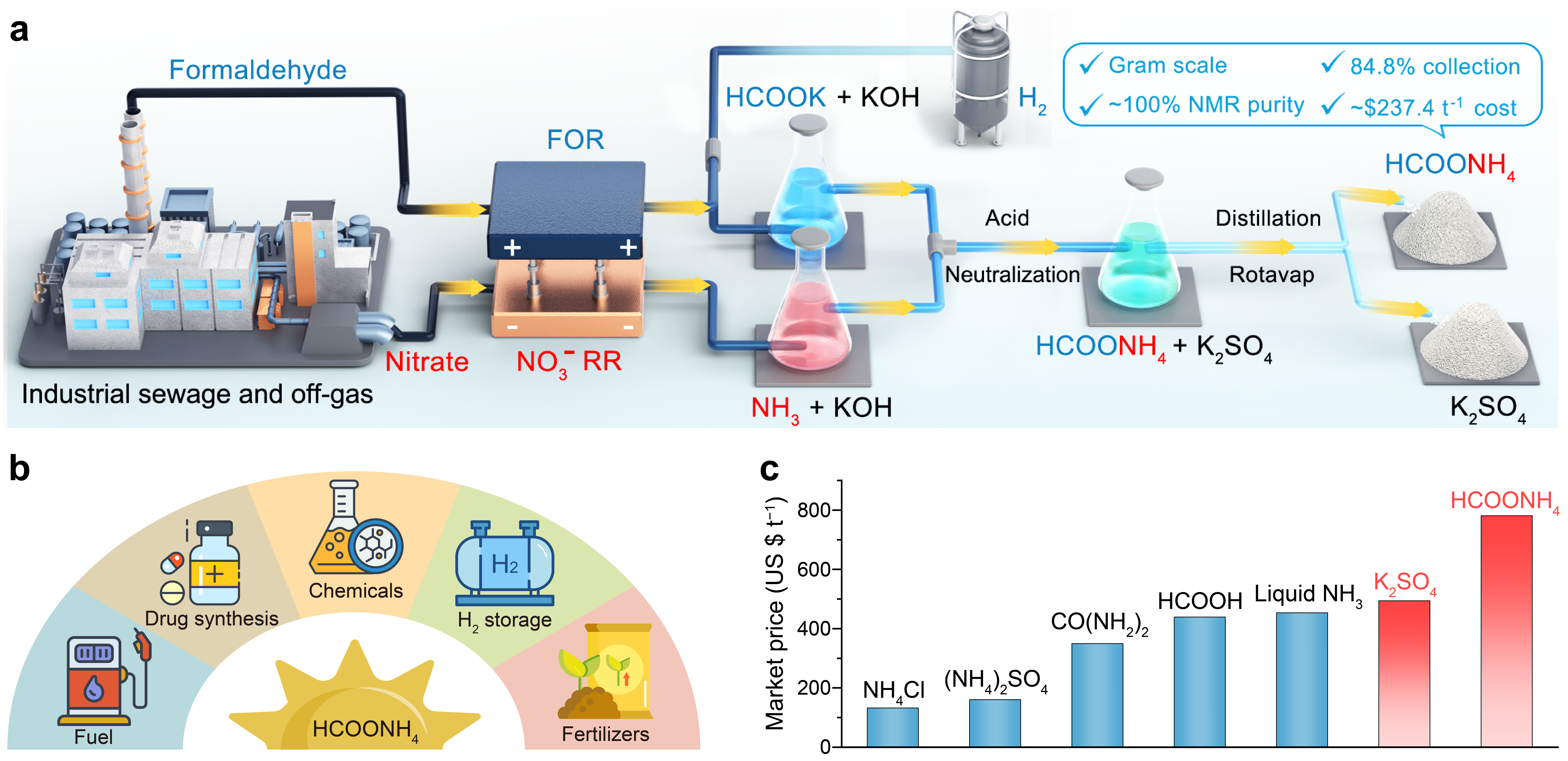 近日,中国科学院福建物质结构研究所韩丽丽研究员团队成功合成了一种Ag单原子修饰的Cu2O纳米线阵列催化剂,该催化剂在硝酸盐还原反应(NO3−RR)中表现出极高的活性,能够在不同硝酸盐浓度下实现高达90%以上的氨法拉第效率(FE),并在0.5M硝酸盐浓度下达到2.3 A cm⁻2的工业级电流密度,氨产率高达184.4 mg h⁻1 cm⁻2,为目前报道的最佳性能之一。该催化剂在甲醛氧化反应(FOR)中同样表现出优异的性能,能够在0.31 V的低电位下实现300 mA cm⁻2的电流密度,并几乎100%选择性地生成甲酸盐。基于该催化剂表现出的出色双功能性,该团队提出了一种创新的串联电化学-化学合成策略,通过将阴极NO3−RR和阳极FOR配对在1.6 V电压下进行100小时耦合电解,并经后续化学步骤处理,成功将阴极NH3产物转化为高价值的纯甲酸铵固体(10.7 g,生产成本粗算约237.4美元/吨),且可同时回收高纯度的K2SO4副产品。该合成路线不仅高效、可扩展且具成本效益,还通过简单的化学步骤实现了NH3的规模化固化存储。这项研究不仅在理论上深化了对NO3⁻RR和FOR反应机制的理解,还在实际应用中展示了规模化氨生产和固定存储系统的巨大潜力,为开发高效、低成本的绿色氨生产技术提供了新的方向。