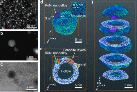 超亲水碳纳米笼锚定RuNi纳米合金结构的三维电镜重构