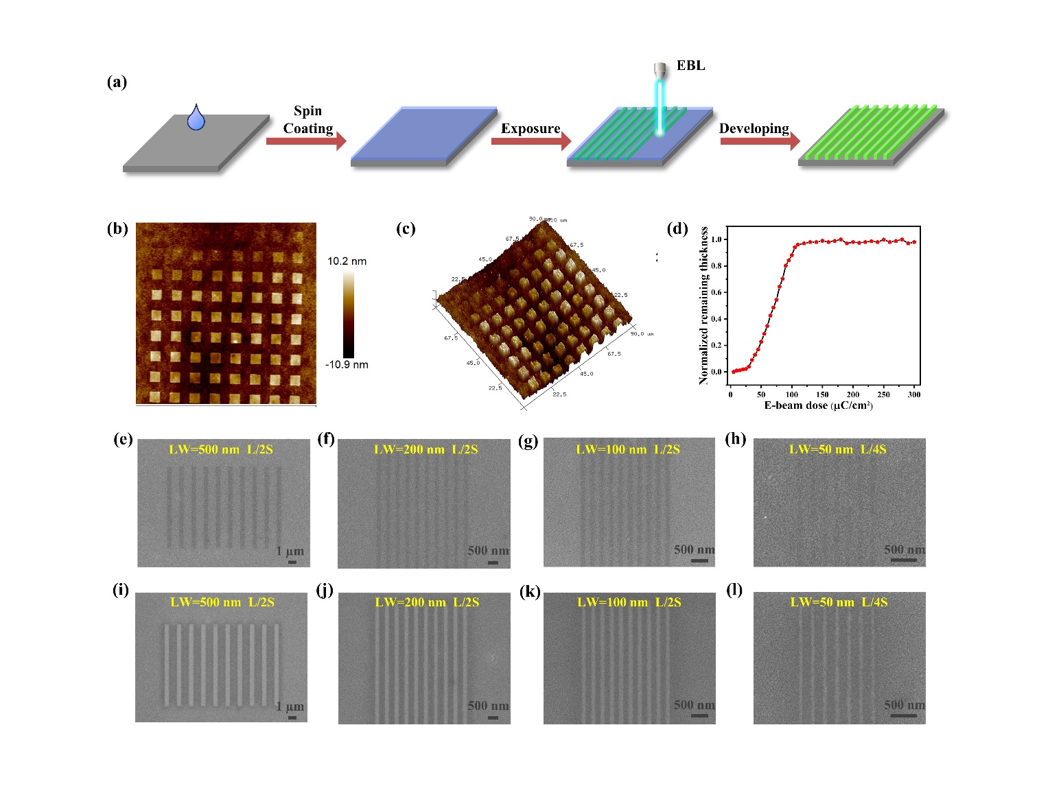 图2:光刻性能验证: (a)光刻工艺流程,(b) 剂量阵列(5-360 μC·cm-2)的二维和三维AFM图像;(d)归一化抗蚀剂厚度随剂量变化曲线;(e-h) 50 μC·cm-2下(50 ~ 500 nm)谱线的SEM图像;(i – l) 400 μC·cm-2下50-500 nm线宽的SEM图像。