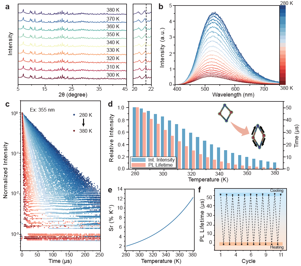 图1 (a) TPP3Cu2Br2随温度变化的XRD图;(b-d) TPP3Cu2Br2的温度依赖光学性能变化;(e-f) TPP3Cu2Br2的温度传感灵敏度和循环稳定性。