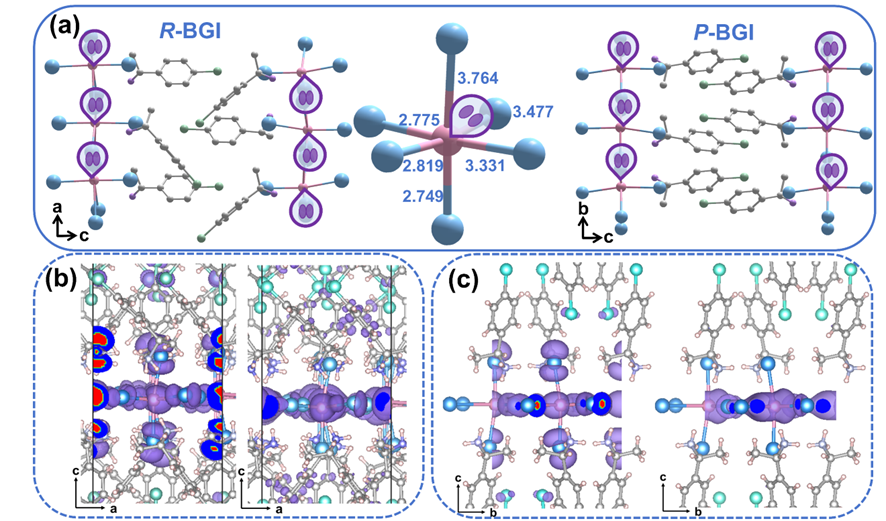 图3. (a) 具有R-BGI的三个短键和三个长键的扭曲[GeI6]4-八面体,孤对电子的大致位置用紫色表示;沿b轴观察的R-BGI无机成分;沿 a 轴观察的 P-BGI 的无机成分。(b) R-BGI中占据电子态的SHG加权密度(左);R-BGI中未占用电子态的SHG加权密度(右)。(c) P-BGI中占据电子态的SHG加权密度(左);P-BGI中未占据电子态的SHG加权密度(右)。