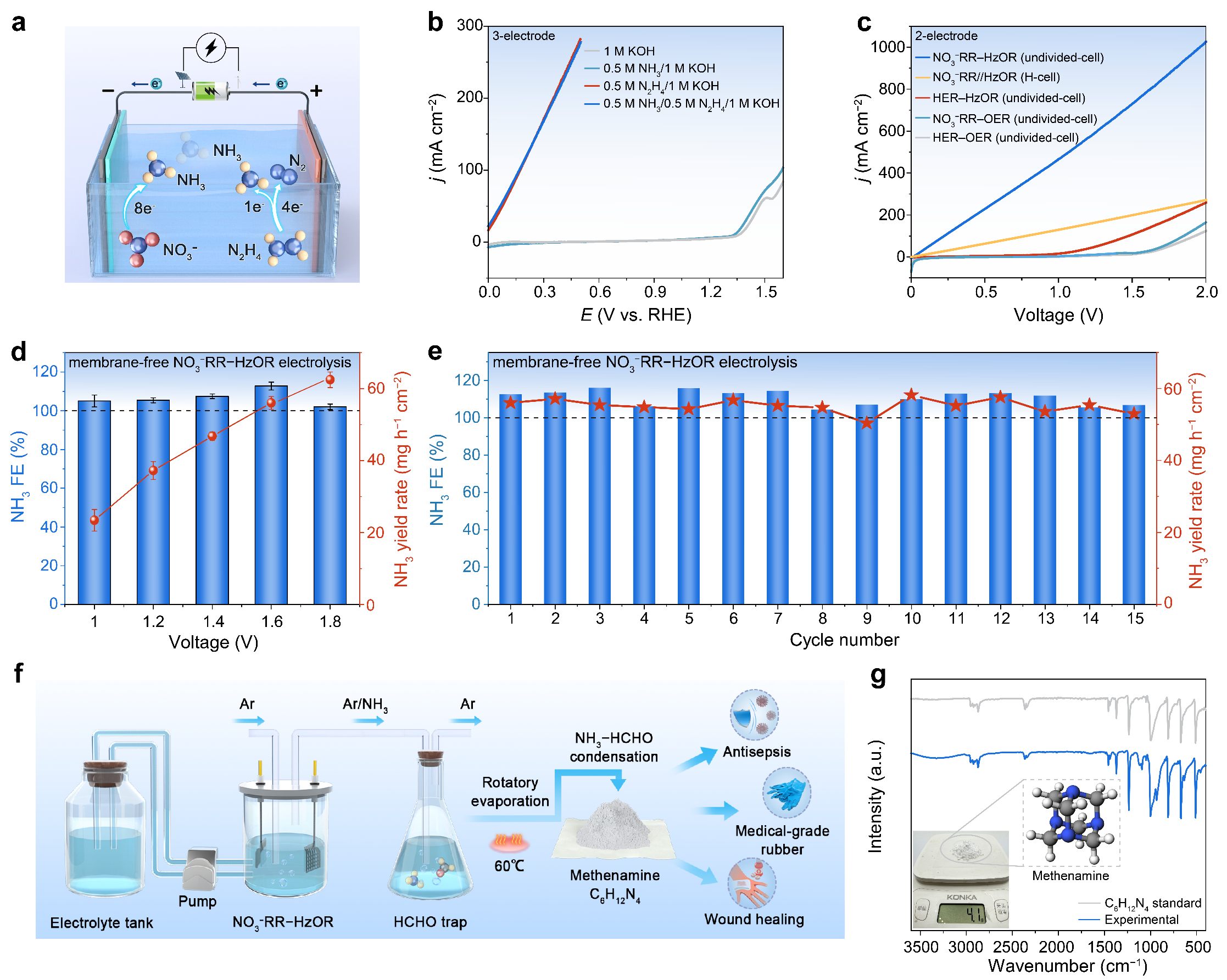 此外,本研究首次构建了一种新型的无膜双极氨电合成体系,可实现超越100%的氨法拉第效率(112.8%),并成功将氨进一步增值转化为具有克级产量的乌洛托品化学品。该工作充分彰显了电化学重构在催化剂结构革新中的巨大潜力,并为高能效电化学合成氨及其增值转化开辟了新路径。