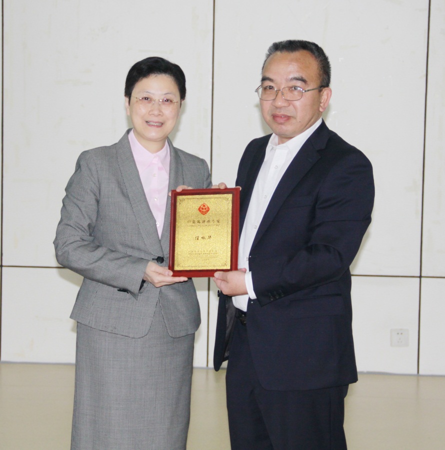 曹荣(右)为任咏华院士(左)颁发“卢嘉锡讲座专家”荣誉纪念牌