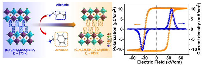 C·cm-2,其高居里温度在目前报道的二维多层杂化钙钛矿铁电体中是最高的,极大拓宽了这类铁电体的工作温度。与南京大学陈爽老师团队合作进行的理论计算分析发现,该化合物的高居里温度来源于晶体结构中芳香族阳离子引起的高相变能垒。此外,得益于结构特性和铁电引起的体光伏效应,该化合物还表现出了优秀的光电性能,其单晶器件表现出大的光电探测开/关比(104)和明显的零偏压光电流。这一工作首次报道了具有高居里温度(483 K)的多层杂化非铅双金属钙钛矿光铁电体,为合理设计具有优异半导体性能的高居里温度光铁电材料提供了新思路。相关研究结果发表在《美国化学会志》(J. Am. Chem. Soc.2021, 143, 15900-15906.)。