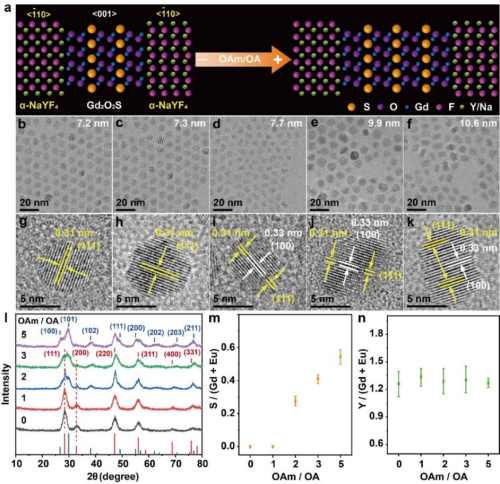2通过改变表面配体OAm/OA比例调控Gd2O2S: Ln3+@α-NaYF4纳米晶的物相、尺寸、结构和元素组成。