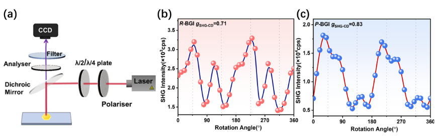 图2.测试原理图 (a)及R-BGI (b) 与P-BGI (c) 的SHG-CD响应。