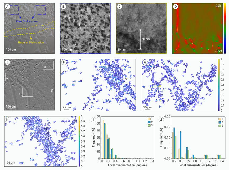 图1 CaF2晶体中位错的形态、分布和取向差分析